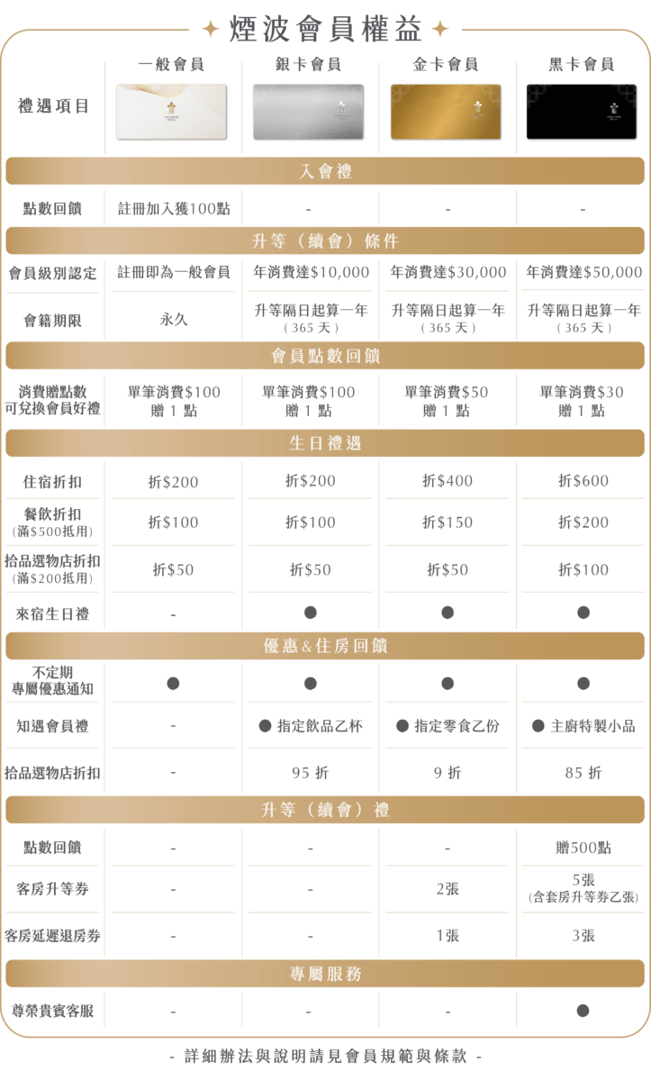 - 住房累點資格之「有效消費」亦即於官網或電話預訂「官網專案」之住宿消費,不得與其他優惠合併使用;使用聯合住宿券、企業券、免費住宿券(加價金額亦不得累點)、OTA到店付款、任何第三方機構之訂房等消費,不列入有效消費範圍內,無法獲得會員禮遇。