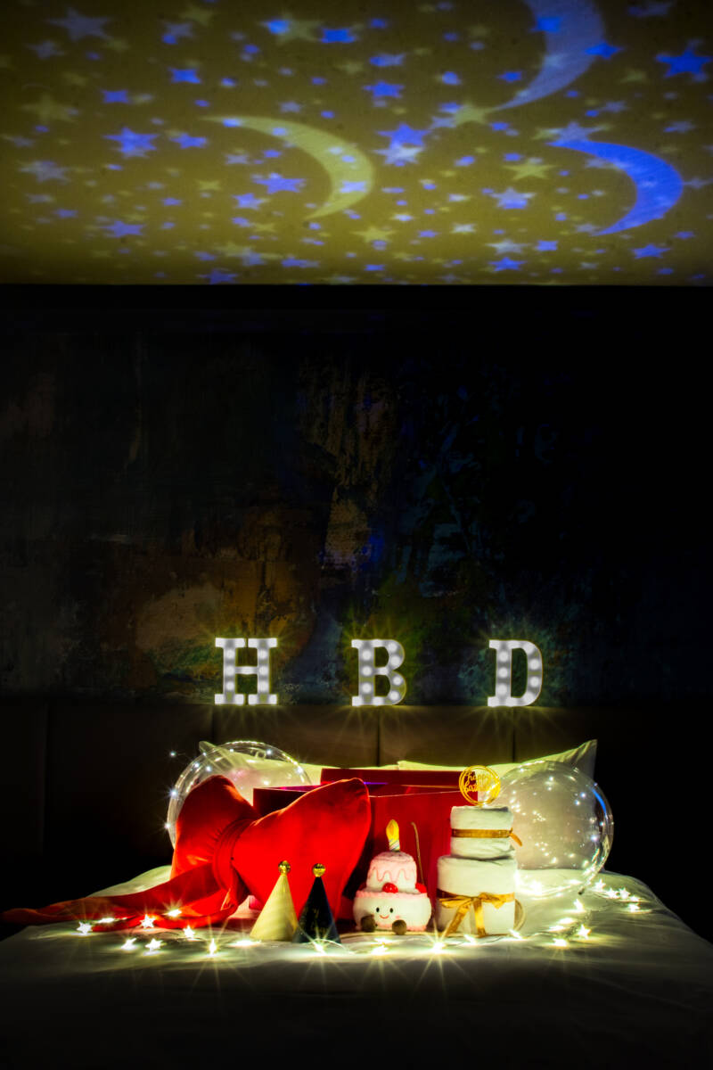 - 房內專屬佈置:H、B、D字母燈、氣氛燈串、驚喜禮物盒組(含投影氣氛燈與蝴蝶結抱枕)、毛巾蛋糕捲、生日蛋糕玩偶