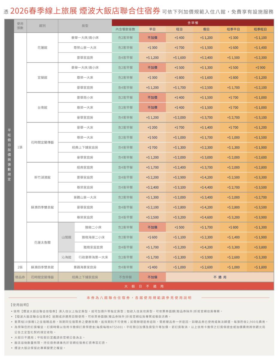 使用【煙波大飯店聯合住宿券】,須入住聯合住宿券指定房型或部分可加價升等的房型,如欲入住其他房型,可依票券面額折抵官網住房專案。詳細加價規範請見👉 2026春季線上旅展商品加價表